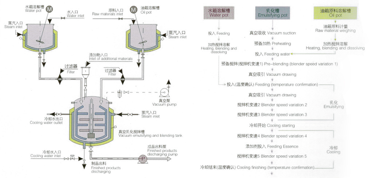 料鍋鍋蓋為自動升降式,水鍋、油鍋中的物料通過輸送管道可在真空狀態(tài)下直接吸入乳化鍋,出料方式為乳化鍋鍋體翻轉(zhuǎn)可傾式,通過電熱管對鍋夾層內(nèi)的導(dǎo)熱介質(zhì)進行加熱來實現(xiàn)對物料的加溫,加熱溫度任意設(shè)定,自動控制。在夾層內(nèi)接入冷卻水就可以對物料進行冷卻,操作簡單、方便,夾層外設(shè)有保溫層。均質(zhì)攪拌與槳葉攪拌可分開使用,也可同時使用。物料微?;⑷榛?、混合、調(diào)勻、分散等可于短時間內(nèi)完成。與物料接觸部位采用不銹鋼(醫(yī)用采用316L材料制造,內(nèi)表面鏡面拋光,真空攪拌裝置衛(wèi)生清潔,采用符合GMP規(guī)范的衛(wèi)生標(biāo)準(zhǔn)制造)。